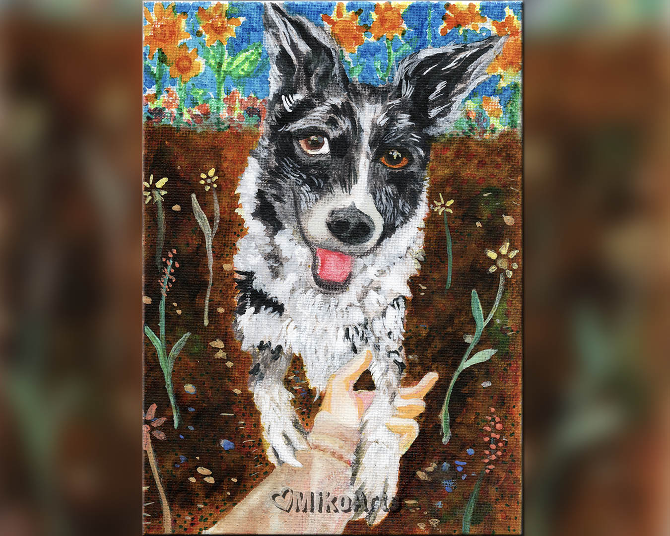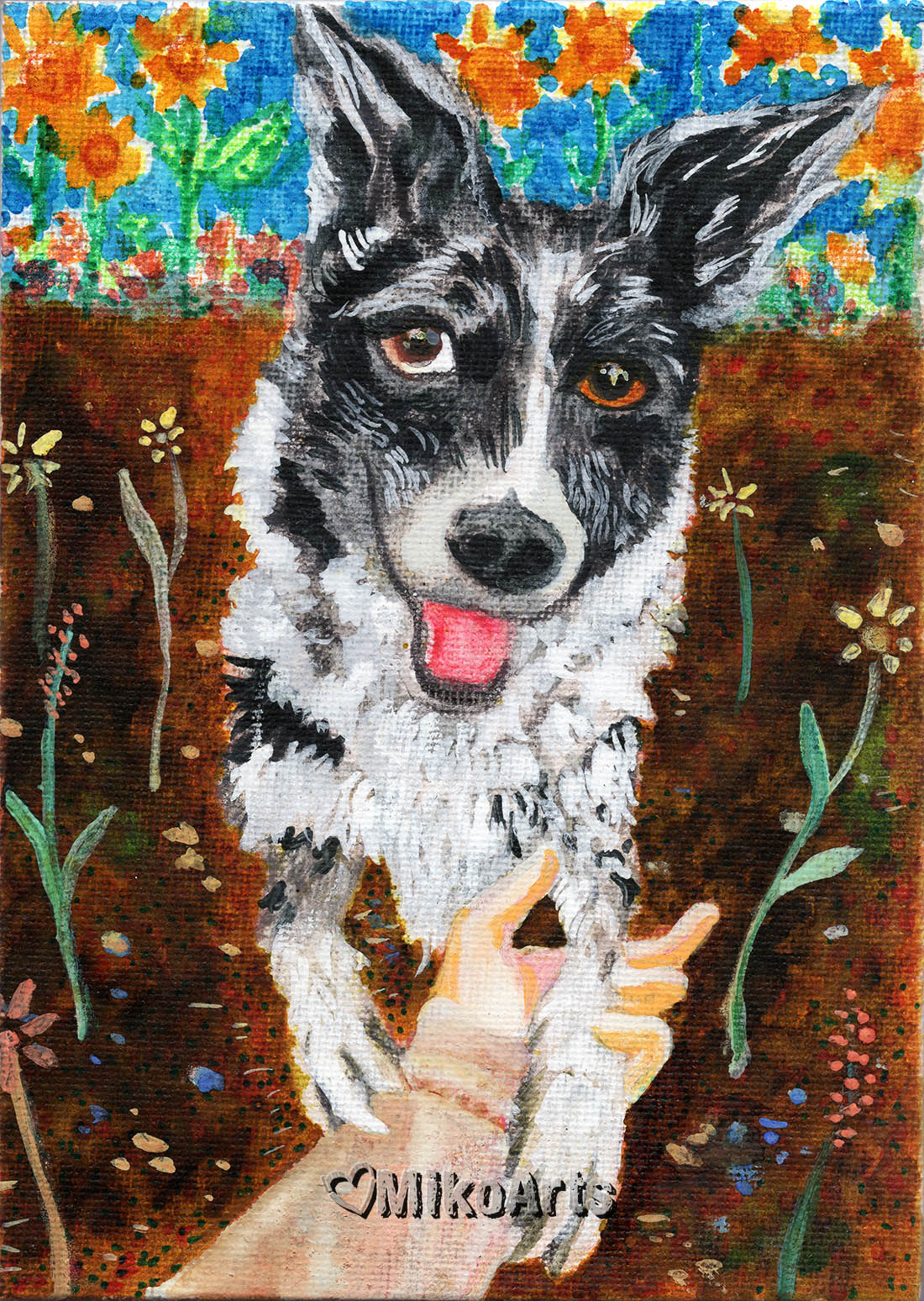 Adventure and bravery, quickness and wits are part of JoJo's innate personality, but it's the love between him and his Human Momma that really make his Loving Heart shine.. In this portrait done from a photo of them taking a moment from one of their walks, JoJo just radiates his overflowing joy and happiness, with his paws embracing the hand of genuine friendship, with his lifelone human pal.